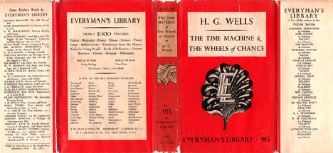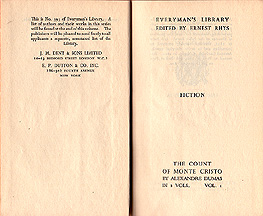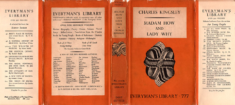 Dust JacketsIn 1935 Everyman's dust jackets were redesigned to look simpler and more contemporary, with an abstract woodcut knot on the front of the jacket. Between 1935 and 1938, a small series number was used on the spine, as with Kingsley's Madam How and Lady Why, No. 777 (1926). After 1938 the series number was significantly larger, as on Dumas' Count of Monte Cristo, No. 393 (1938). Beginning in 1945, the abstract knot was replaced on some volumes with a scallop-like design overlaid with an 'EL', as with Wells' The Time Machine & The Wheels of Chance, No. 915 (1949). The scallop design was used on all jackets starting in 1951. Occasionally a blurb for the book is found on the front dust jacket flap; otherwise advertisements for other books in the series are featured on the jacket flaps and rear panel. The top of the jacket spine indicates the section of the Library to which the book belongs. In some cases, only one part of the dual categories (Belles-Lettres & Essays, Philosophy & Theology, and Poetry & Drama) is indicated on the jacket spine. | |||||||